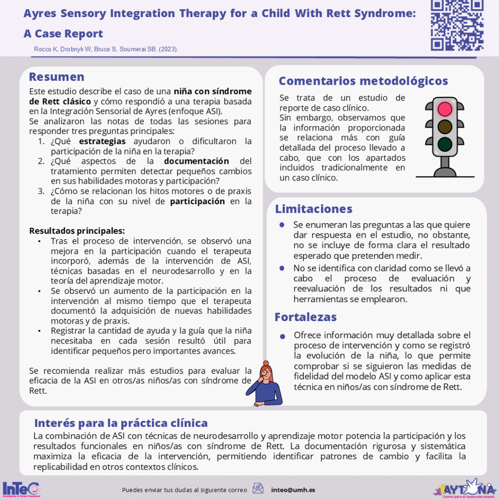 El estudio analiza la efectividad de la Terapia de Integración Sensorial de Ayres (ASI) en una niña de 8 años con síndrome de Rett, que requería asistencia completa para las actividades de la vida diaria. Se realizaron 36 sesiones de intervención (3 veces por semana), integrando ASI, técnicas de neurodesarrollo y estrategias de aprendizaje motor. El objetivo principal fue analizar el impacto de la intervención en el desarrollo de habilidades motoras y en la participación de la niña en sus ocupaciones diarias. - Contextualización e importancia para los terapeutas ocupacionales